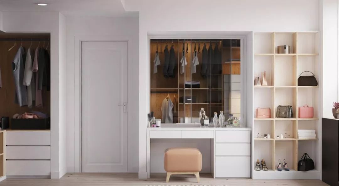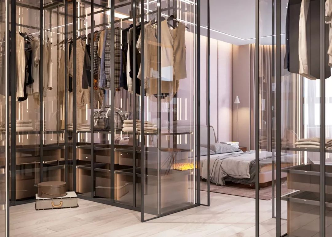在我们的固有思维里,衣柜一般都是封闭式的,采用刷漆的柜门将所有衣物遮挡起来,达到与室内风格和谐、统一的视觉效果。